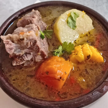 • Cazuela humeante: un caldo dorado con zapallo, papas y choclo que calienta el cuerpo y reconforta el alma.